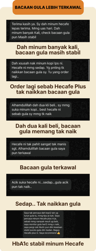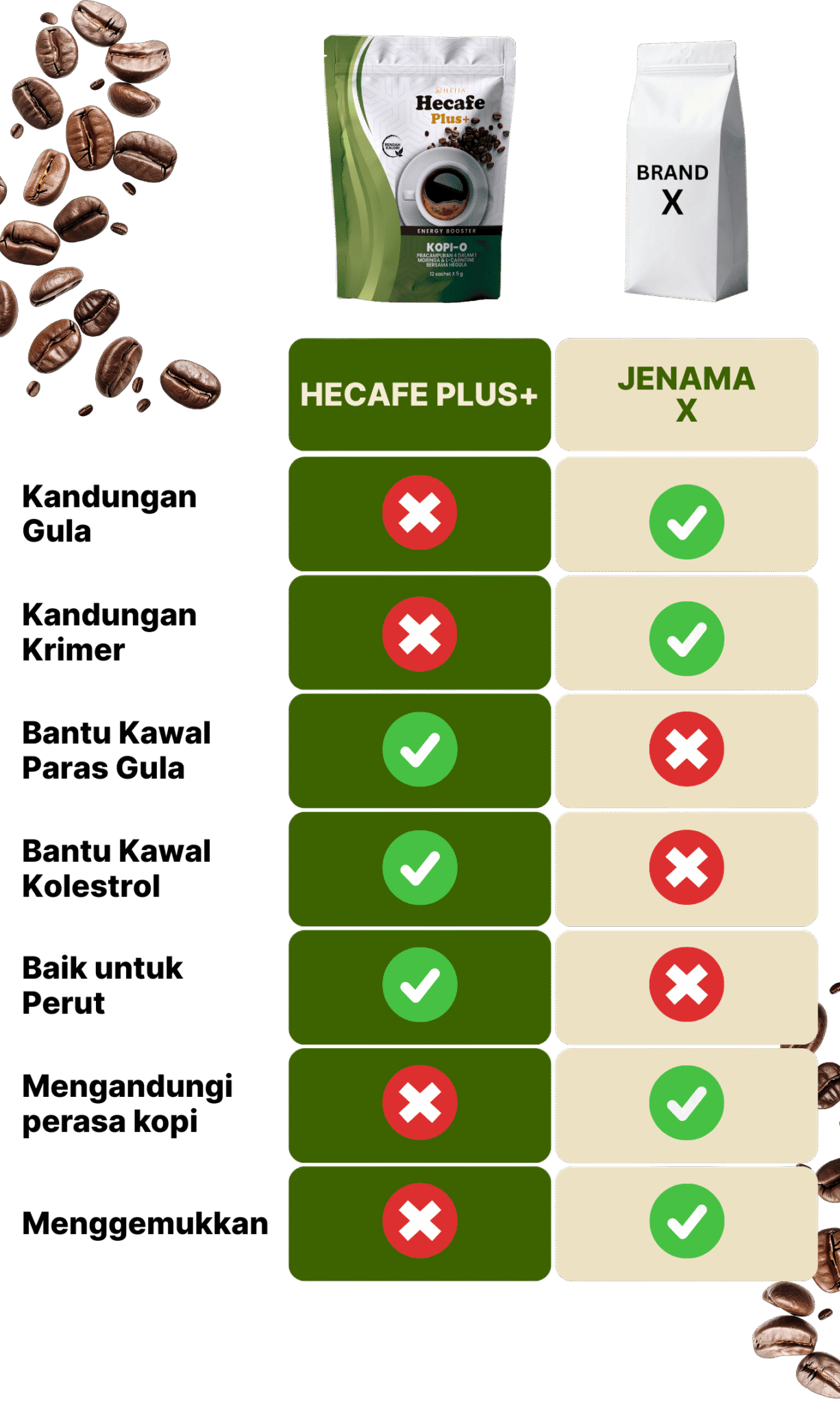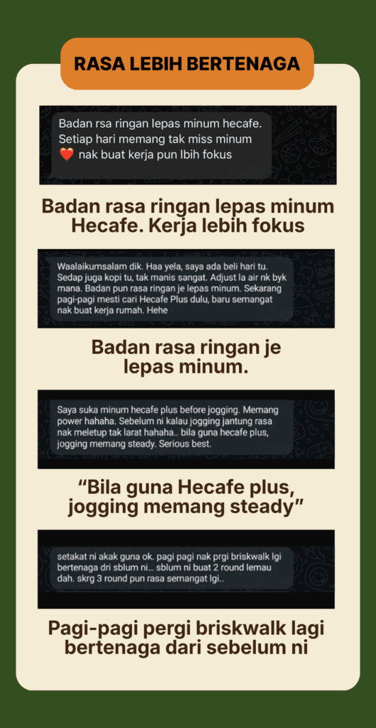 Hecafe tak ada gula putih, dan menggunakan L-Carnitine yang boleh mendorong proses pembakaran LEM. Dan dalam masa sama, Hecafe+ juga guna pemanis semulajadi Hegula – jadi sesuai untuk yang tengah diet atau nak jaga kalori.