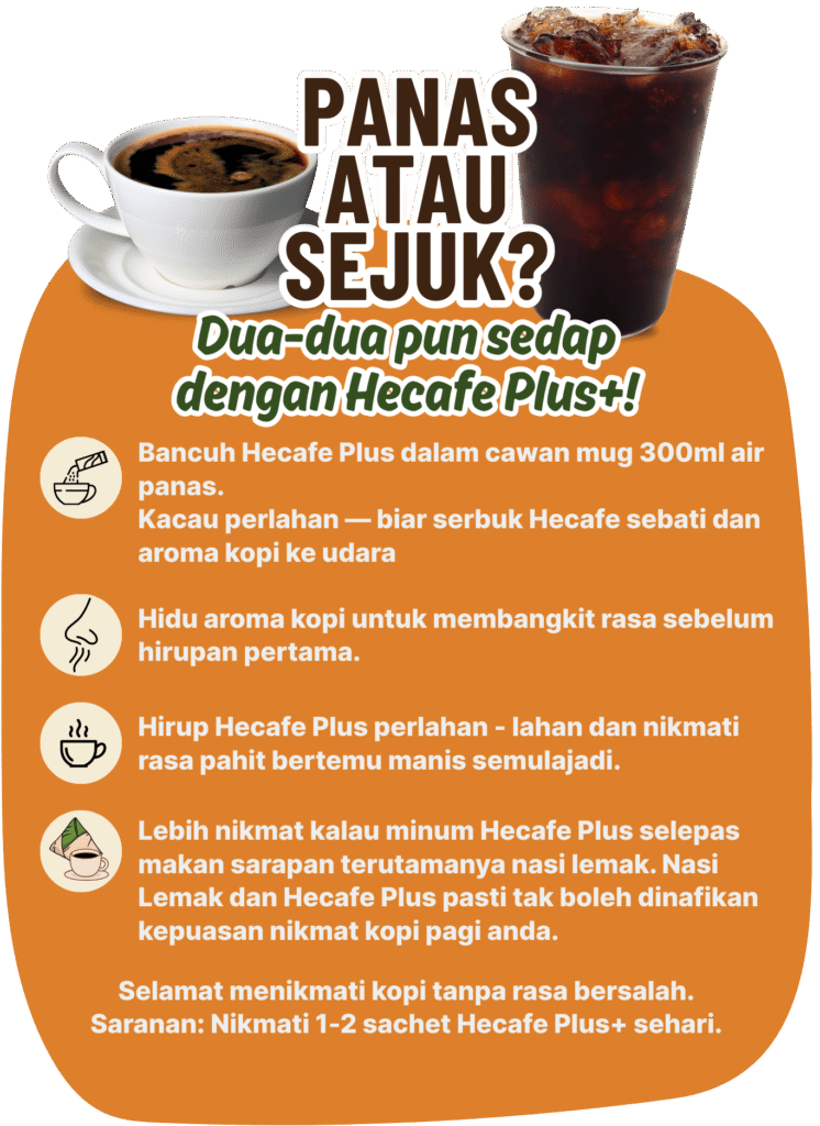 Mudah je! Bancuh 1 sachet dengan 150ml – 180ml air panas atau sejuk. Kalau nak lebih sedap, boleh letak ais ❄️ Tak perlu tambah gula sebab Hecafe guna Hegula.